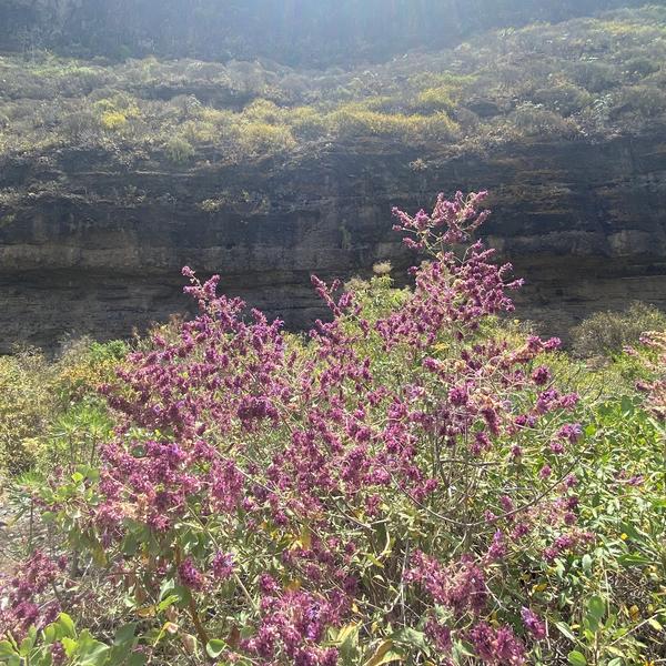 Superado el viaducto de Albiturria, tras una curva y una ligera ascensión nos encontramos ante la imponente pared vertical de Tafira, a nuestra izquierda, precedida de un pequeño valle repleto de plantas silvestres como balos, salvias canarias, tabaibas o aeonios.